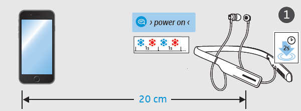 在执行该操作的过程中,确保耳机已关闭并位于距智能手机20厘米的范围内。按住电源键2秒开机,首次开机时,耳机会自动转入配对模式。