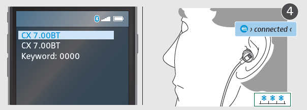 4. 在所发现的蓝牙设备中,选择“CX 7.00BT”。必要时,请键入默认PIN码“0000”。如果配对成功,则会听到语音提示“connected”,LED闪烁蓝色光3次。