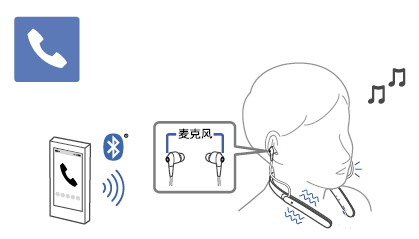 当来电呼入时,会通过耳机听到铃音,且指示灯(蓝色)快速闪烁。此外,耳机的右侧单元振动(接收电话振动功能)。