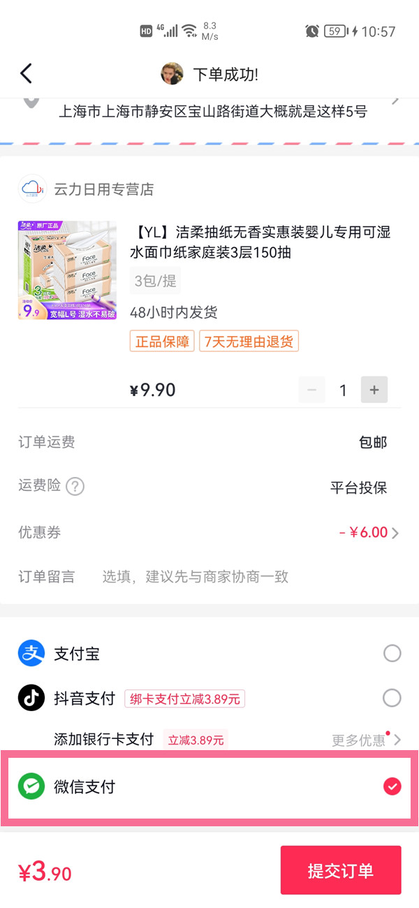 2、下单后在订单页面勾选【微信支付】完成支付即可。