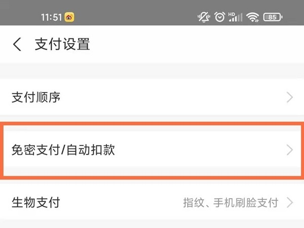 3、在支付设置页面点击【免密支付/自动扣款】。