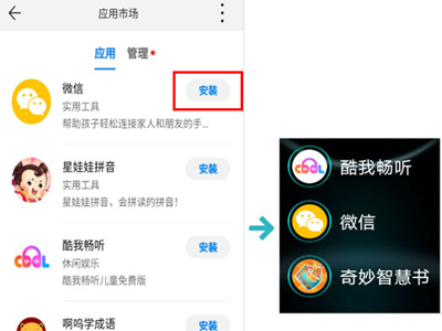 2、在“应用市场”中找到“微信”,点击“安装”即可将App装进儿童手表里,就可以登录微信互发语音信息,互相发送表情,按住麦克风还能说话。