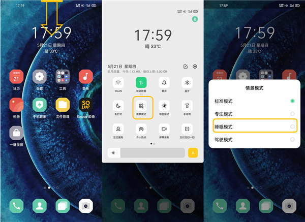 1、从屏幕顶部下拉状态栏和控制中心—点击【情景模式】—选择【睡眠模式】。