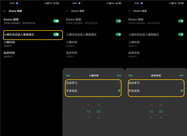 3、【入睡时自动进入睡眠模式】需单独开启,开启后,默认自动学习用户的入睡时间和起床时间,也可以手动设定入睡时间和起床时间。