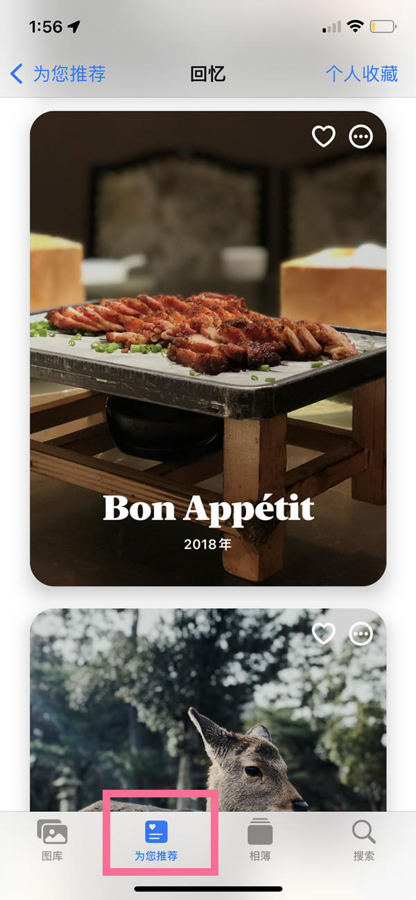 1、打开“照片” App,点击底部的【为你推荐】进入回忆功能页。