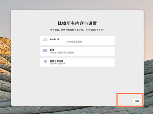 2、再点击继续,根据系统提示进行操作即可恢复出厂设置。