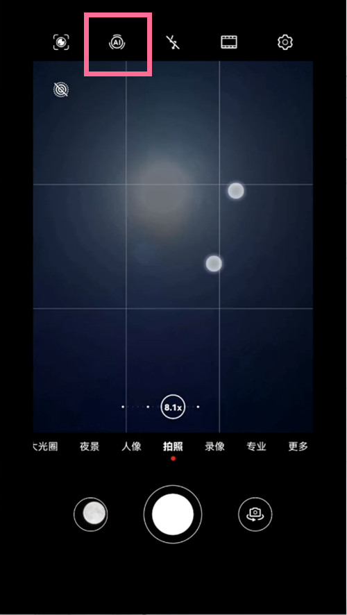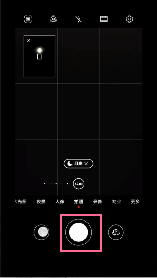 3、将镜头对准月亮,在屏幕上张开双指,放大画面,将焦距放大到10X或以上自动进入月亮模式,然后点击拍摄按钮即可。