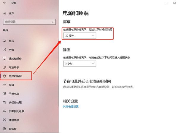 3、点击【电源和睡眠】,自定义选择屏幕时间即可。