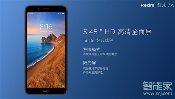 红米7A正面搭载5.45英寸HD护眼屏,屏幕比例为18:9,护眼模式等级提升至255阶,拥有阳光屏功能。