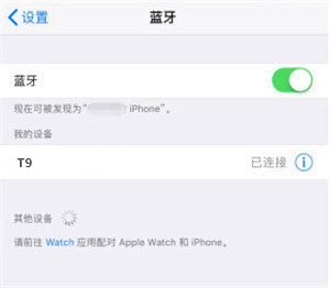 3.此时iPhone的蓝牙设备搜索列表上会出现索爱t9耳机的名字,如果没有,请尝试刷新蓝牙功能界面。在设备名称选项中选择“T9”,并按照iPhone上显示的说明步骤配对连接。