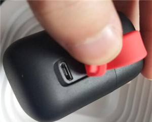 1.Havit G1耳机的充电盒充电接口在盒子的后侧,有保护盖遮挡,扣开保护盖可以看到采用的是 micro USB 充电接口。