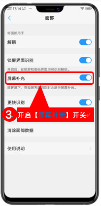 3.在面部菜单中,打开屏幕补光选项的开关即可。