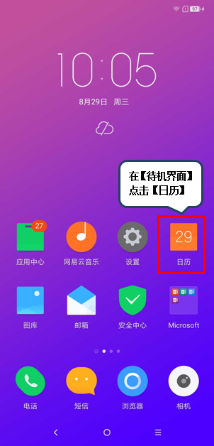 1、在【待机界面】点击【日历】。