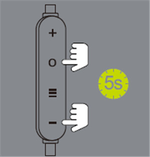 2.同时按下耳机的多功能按钮和“-”号按钮 5 秒钟左右,可以清除掉之前的配对信息,同时耳机中传来“蓝牙已断开”语音提示。
