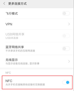 1.将手机上的NFC功能设置为开启状态,一般在手机“设置”菜单的“更多连接方式”或者“连接设备”中可以找到。