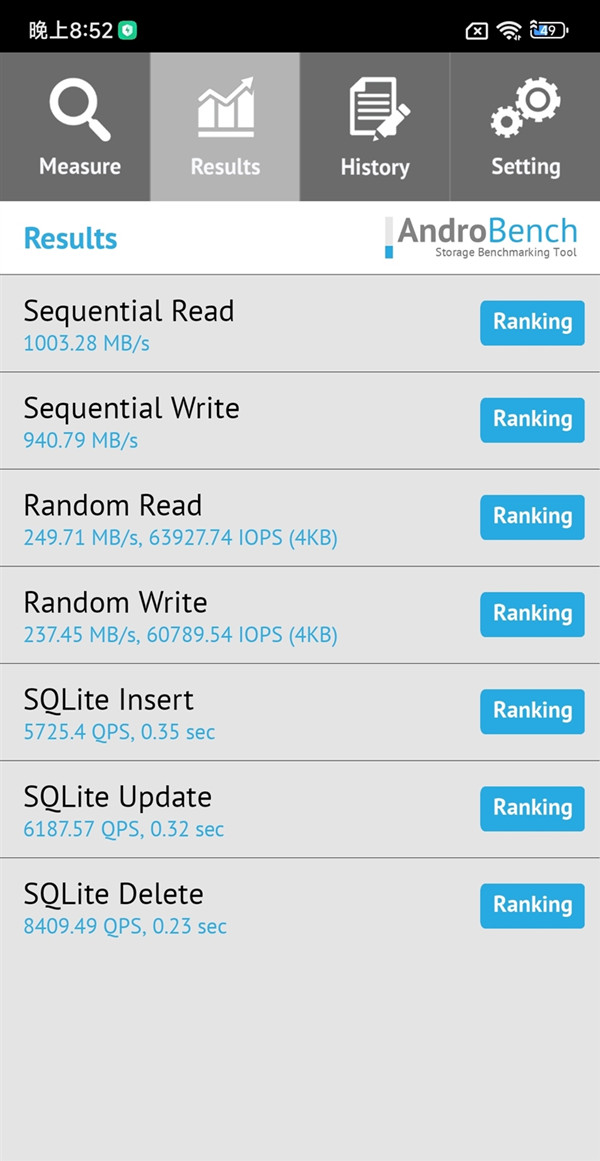使用Adrobench进行测试。Redmi Note 12 探索版的顺序读取速率为1003.28MB/s,顺序写入速率达940.79MB/s,随机读取速率达249.71MB/s,随机写入速率达237.45MB/s。综合来看,Redmi Note 12 探索版的存储性能达到了UFS2.2的级别,在中端手机中也算常规水平。