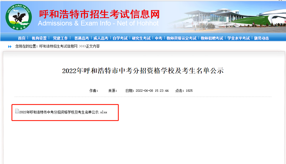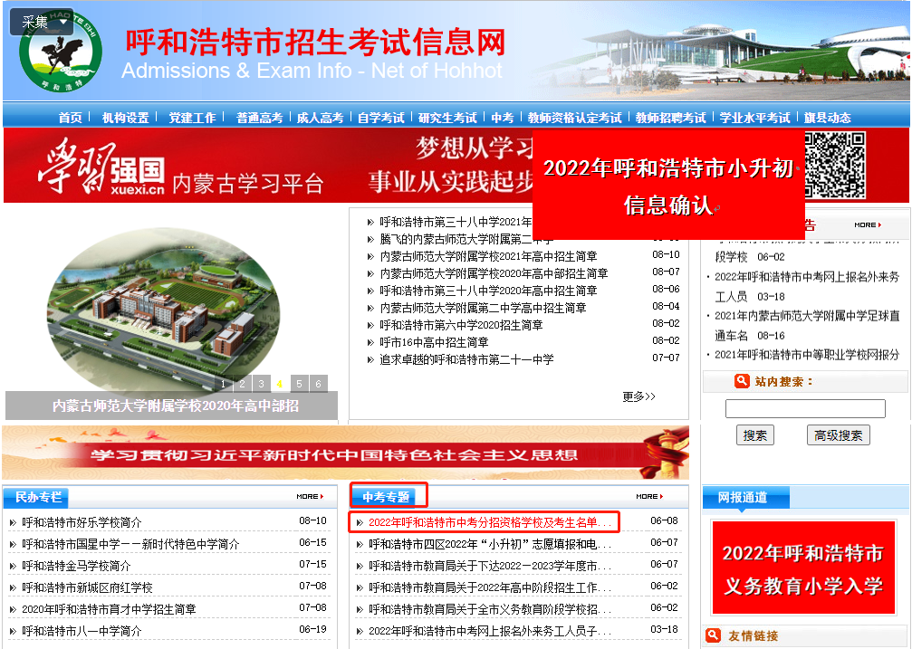 进入呼和浩特市招生考试信息网,进入“中考专题”,点击“”2022年呼和浩特市中考分招资格学校及考生名单公示”进入;