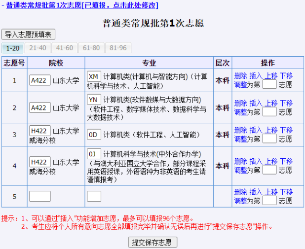 注意:填报志愿系统仅保留本次填报志愿信息。
