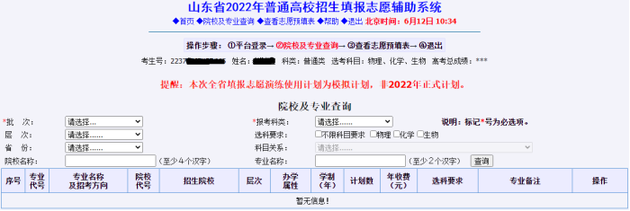 输入相关查询信息、点击查询,系统显示符合条件院校、专业,如下图: