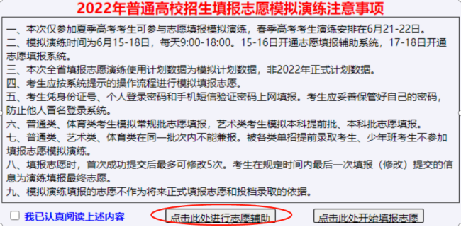 认真阅读上述重要提示、勾选“我已认真阅读上述内容”、“点击此处进行志愿辅助”,进入登录界面,如下图: