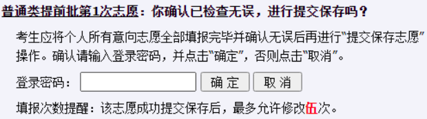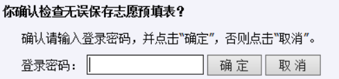 考生点击“保存志愿预填表”,系统提示让考生确认并输入登录密码,如下图: