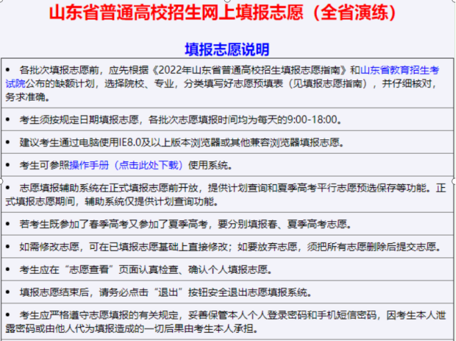 点击“网上填报志愿演练<点击进入>”进入志愿填报演练说明界面,如下图: