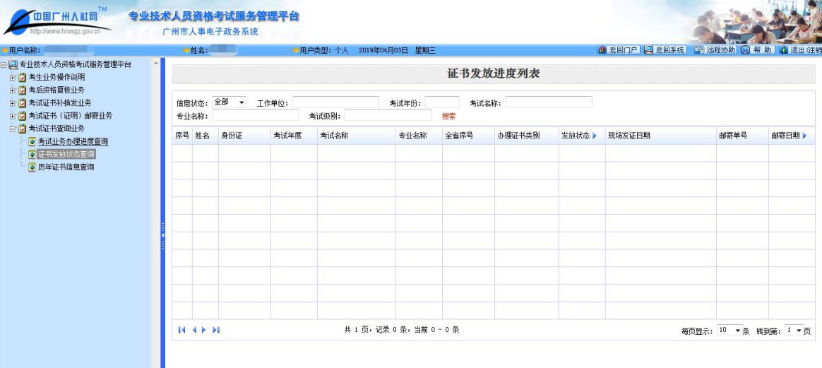 13、寄出证书后,请在左边菜单栏选择“考试证书查询业务”,点击【证书发放状态查询】,查看寄出证书的邮寄单号和邮寄日期,留意接收证书并支付邮费。