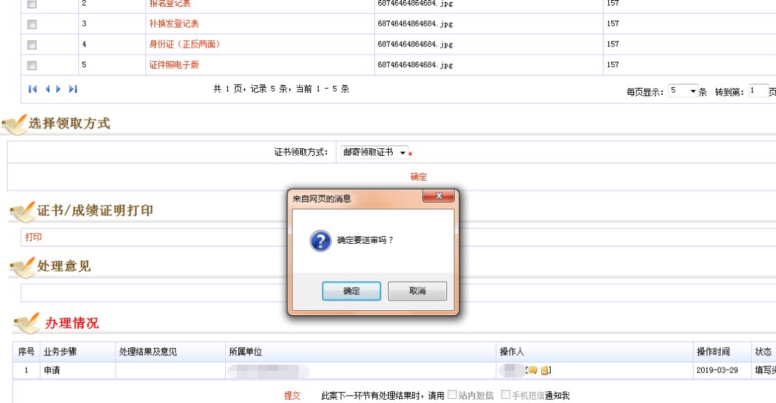 10、选择【邮寄领取证书】或【现场领取证书】。确认资料无误后,点击屏幕下方【提交】,并【确定】送审。