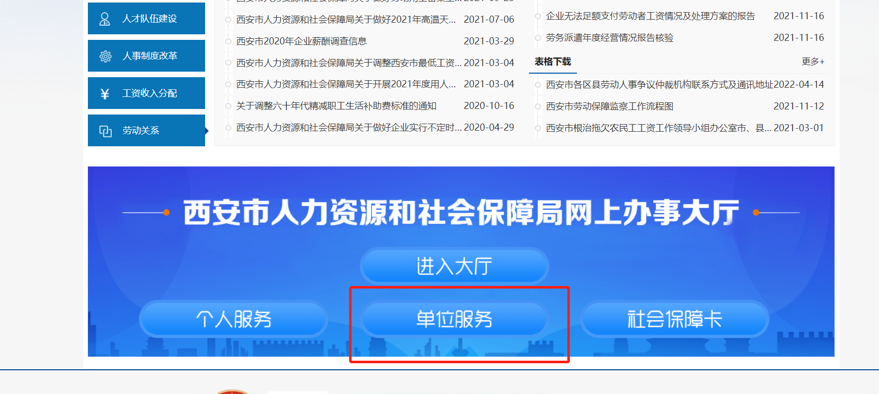 西安市人力资源和社会保障局官网(http://xahrss.xa.gov.cn)——网上服务——西安市人力资源和社会保障局网上办事大厅“单位服务”