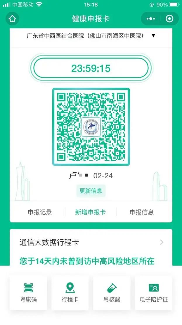 5、健康申报卡可直接选择查看行程卡、粤康码、粤核酸(动态码,截图无效)。