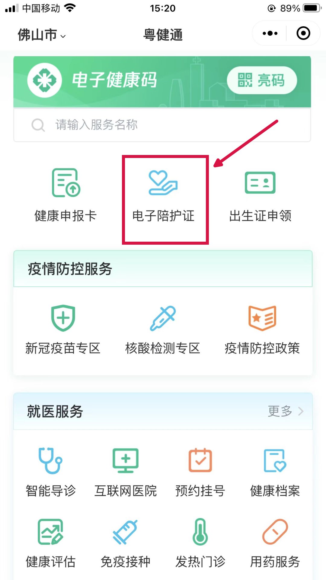 1、扫码进入“粤健通”小程序,点击“电子陪护证”进入电子陪护证申领界面或通过医院现场的葵花码扫码即可进入电子陪护证申领界面。