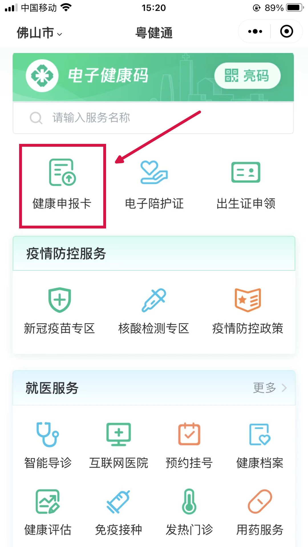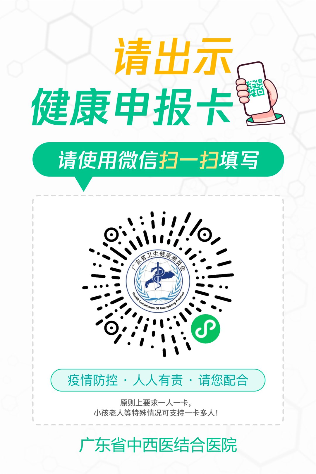 1、现场扫码“广东省中西医结合医院”专属葵花码或在微信搜索“粤健通”小程序,点击【健康申报卡】。