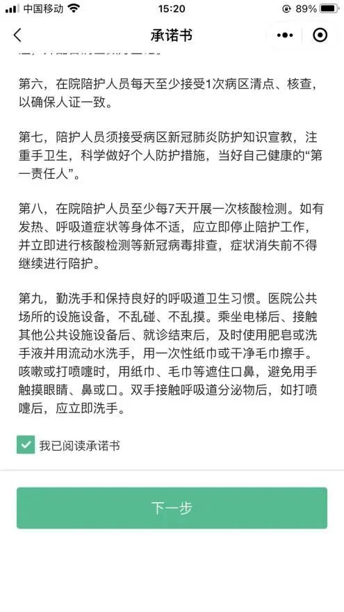 2、阅读《个人防护承诺书》并勾选承诺后,点击【下一步】。