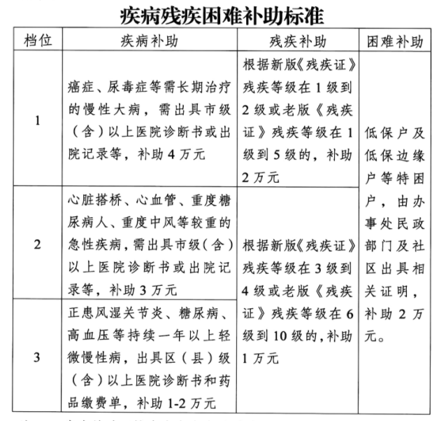 1.疾病补助可按患病家庭成员累计,同一人患有多档多种疾病的按所患最高档疾病补助一次。疾病补助、残疾补助、困难补助累加计算补助款总额原则上不得超过10万元。