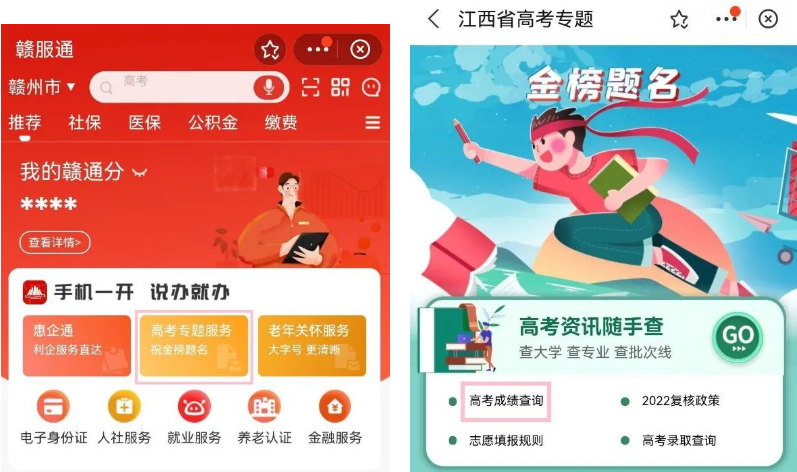第二步:在“赣服通”首页点击“高考专题服务”,点击选择“高考成绩查询”服务。