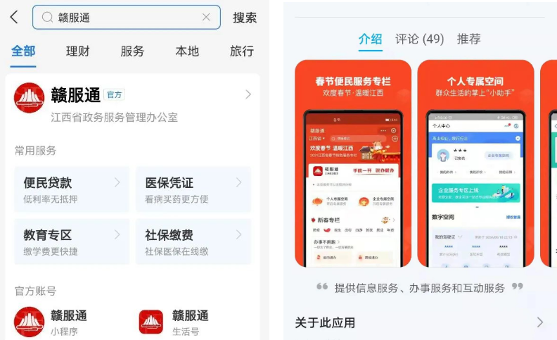 第一步:支付宝搜索“赣服通”,或在应用市场下载“赣服通”APP进入平台。
