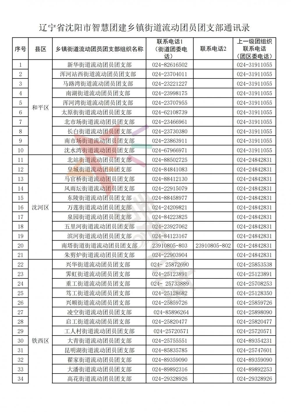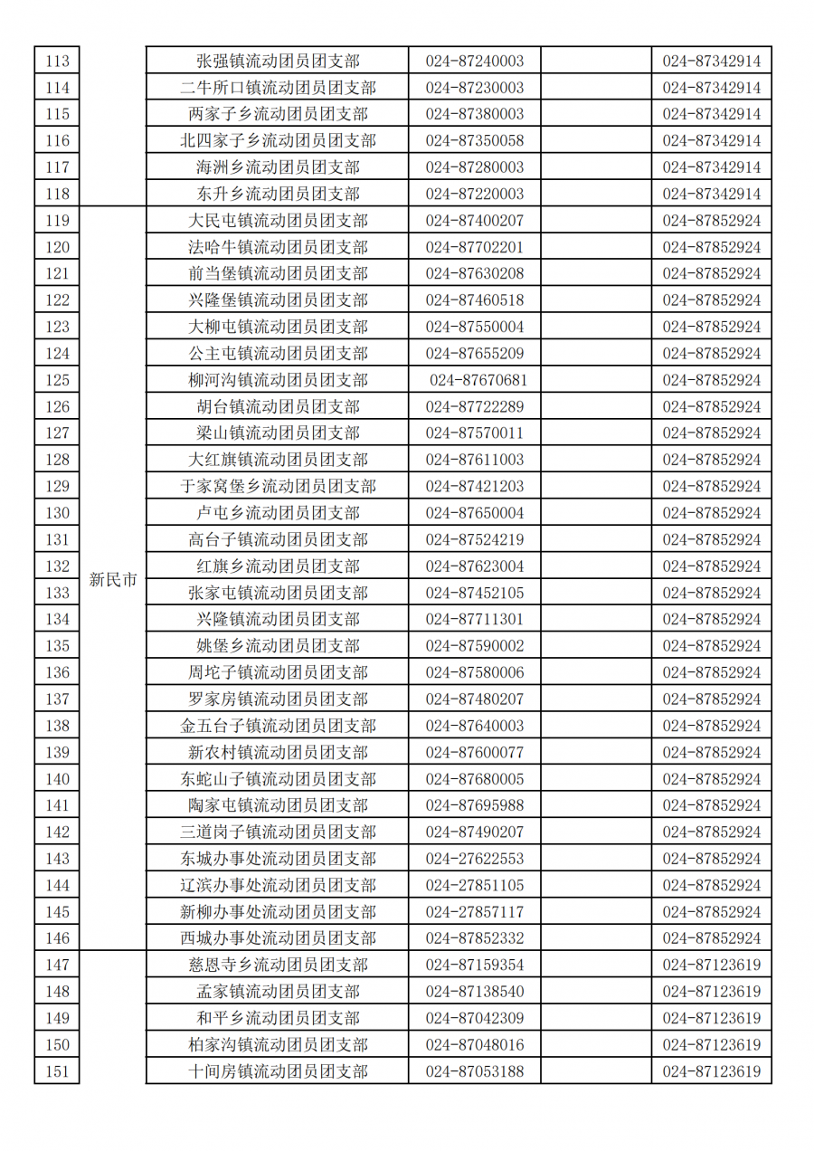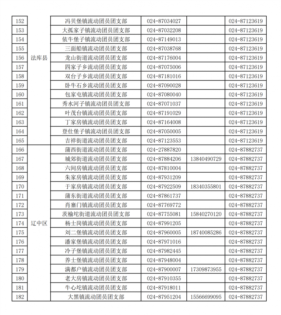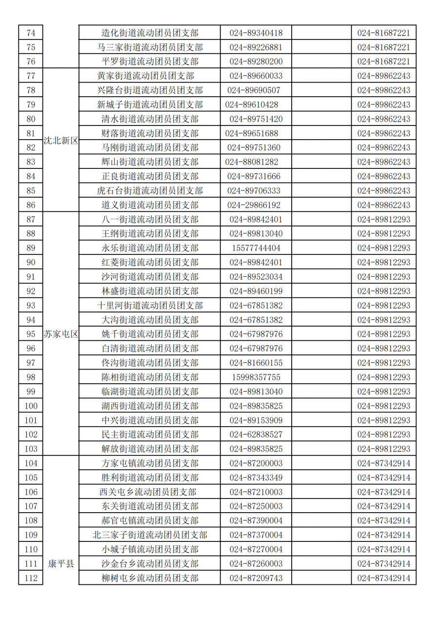 沈阳市各街道乡镇流动团员团支部团组织关系转接咨询电话汇总