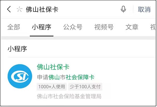 打开微信,在搜索框中搜索“佛山社保卡”微信小程序。