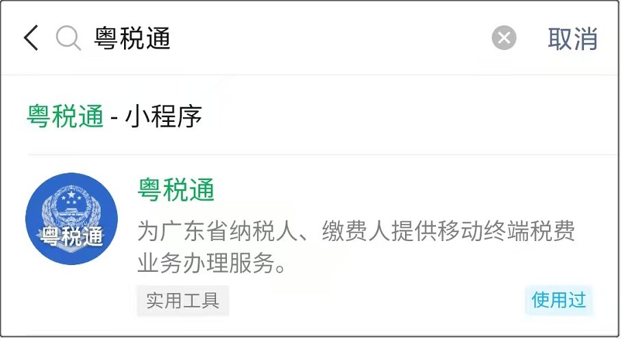 第一步 打开微信→发现→小程序,搜索“粤税通”微信小程序,进入界面。