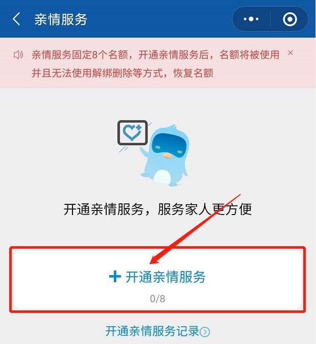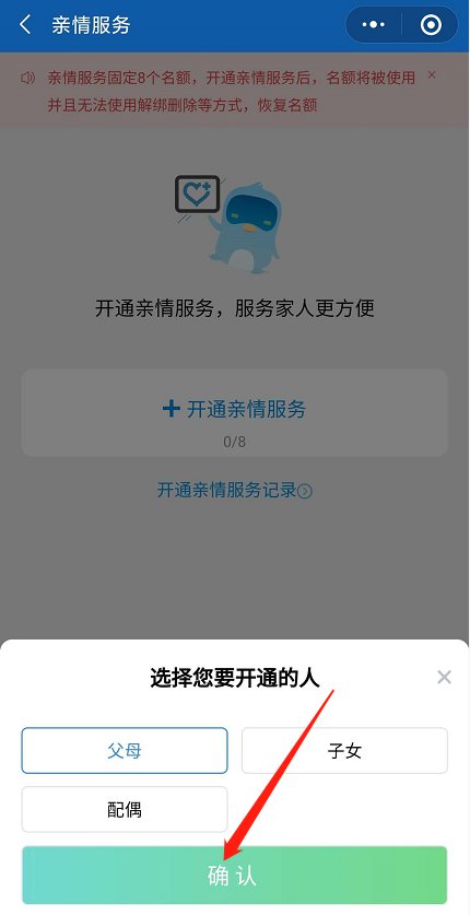 在首页右上角点击“我的”,找到【亲情服务】标签,点击【开通亲情服务】,选择你要开通的人,添加信息即可开通!