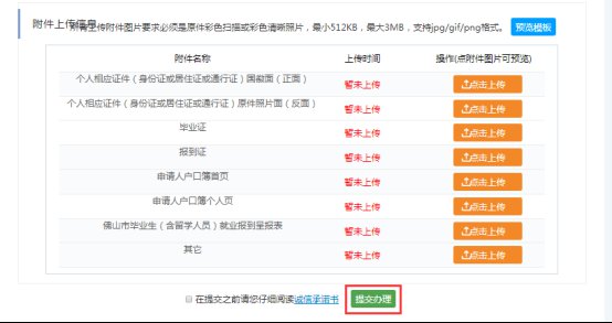 1、登陆佛山人才网www.fsrlzy.cn在线申请(进入在线办理-全国普通高校毕业生就业报到-网上办理),个人注册后上传《身份证》、《户口簿》、《报到证》、《毕业证书》和《佛山市毕业生(含留学人员)就业报到呈报表》提交办理。