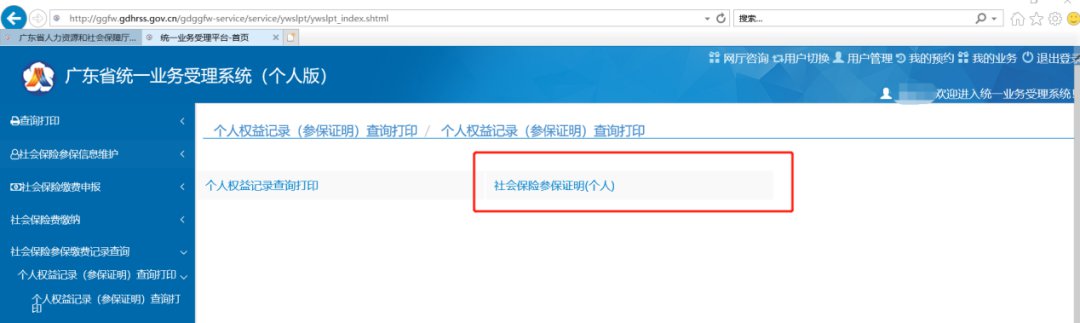 ③在业务受理系统菜单里找到【社会保险参保缴费记录查询 】,点击下方【个人权益记录(参保证明)查询打印】,点击右面页面【社会保险参保证明(个人)】。