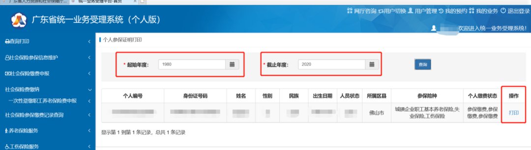 ④ 选择起始年度和截止年度点击查询,选择对应的记录点击【打印】,可打印个人参保证明。