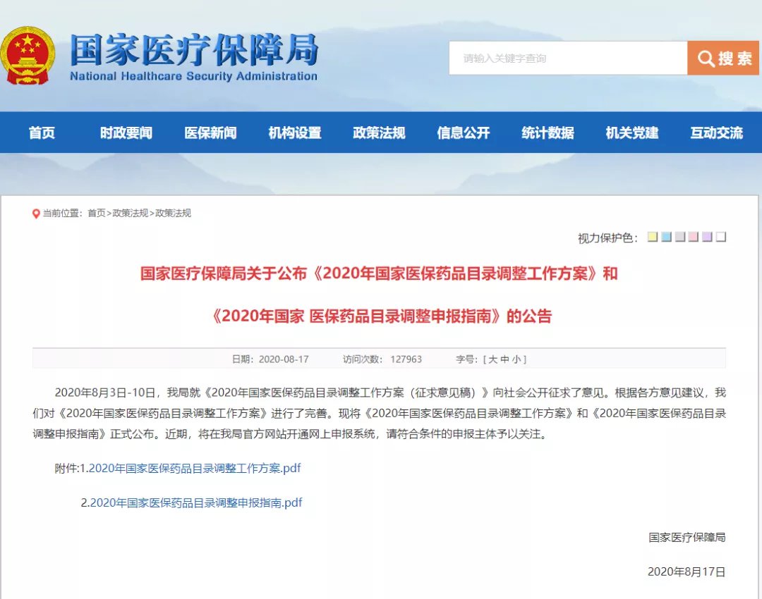 2020版医保目录将采用一年一调整的方式,且符合条件的企业可以进行申报,国家医保局也将于近期在其官方网站开通网上申报系统,8月21日-30日进行网上申报,之后提交纸质申报材料。