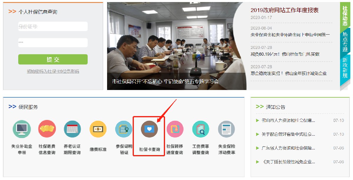 1、登录佛山社保的门户网站:http://fssi.foshan.gov.cn ,在主页面的“社保卡查询”查看社保卡服务银行、发卡网点以及申办状态。