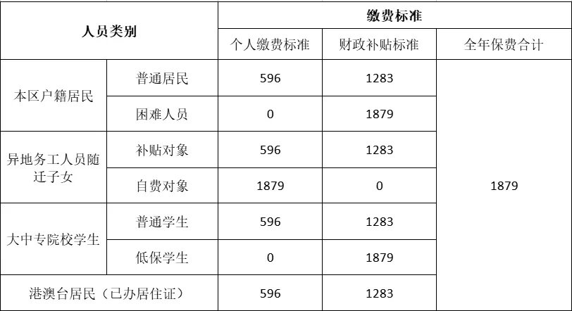 1、本区户籍居民(特困供养及低保对象等特殊人员除外)、已办理居住证的港澳台居民、可享受财政补助的随迁子女、大中专非新生:2022年度个人缴费标准为596元,财政补助标准为1283元,合共每人1879元。