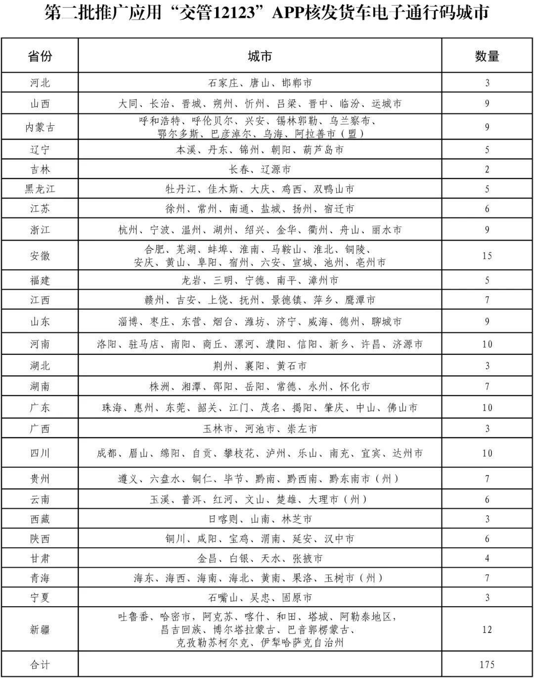 在全国第一批70个城市推广应用的基础上,石家庄、杭州、成都等175个城市第二批推行网上核发货车电子通行码,货车驾驶人或管理员可以通过“交管12123”APP快速查询推广应用城市的货车禁限行和通行码申领规定,按需申领和便捷出示货车电子通行码。