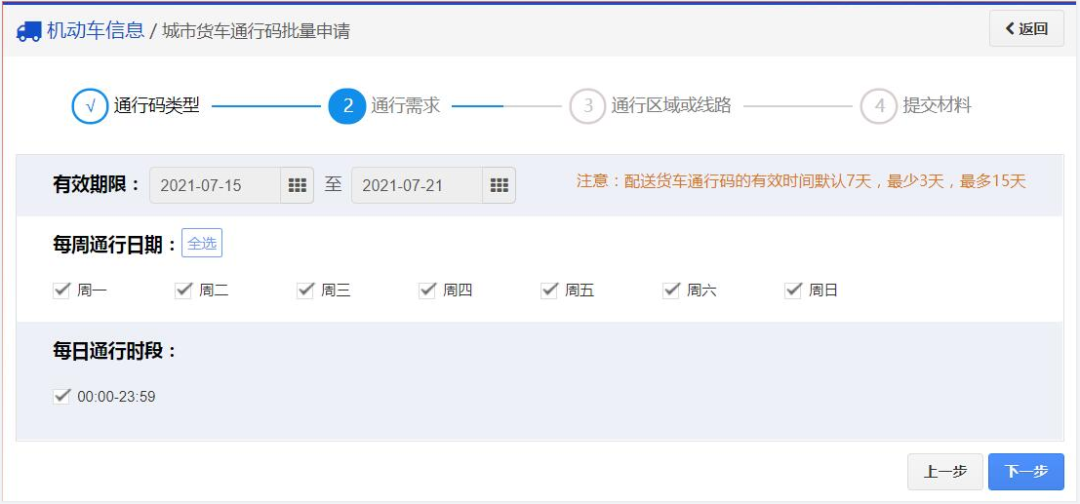 04、接下来选择通行日期。有效期起始日期只能选择一周后的日期,如:今天9月22日,那么只能选择9月29日。结束日期可根据各单位需要填写。(注:不可以超过行驶证上的有效期,通行时间段及通行日期可以自由选择。)