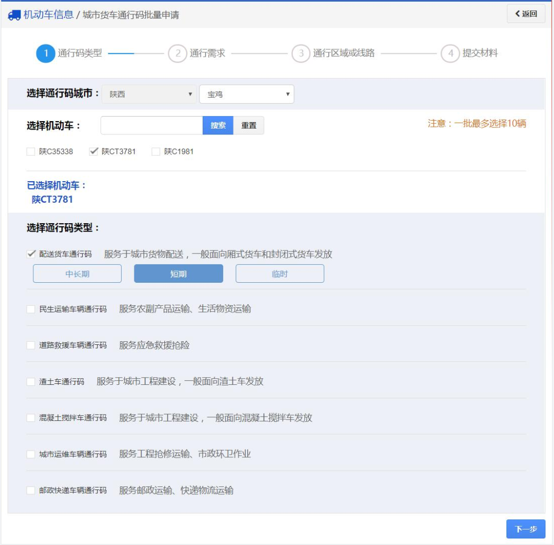 03、点击城市货车通行码批量申请,下面可以选择多辆车,再选择通行码类型(临时、短期、中长期)。然后进行下一步。