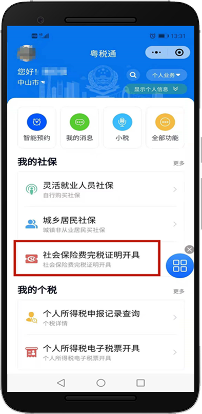 (1)用手机微信登录“粤税通”,点击“社会保险费完税证明开具”。